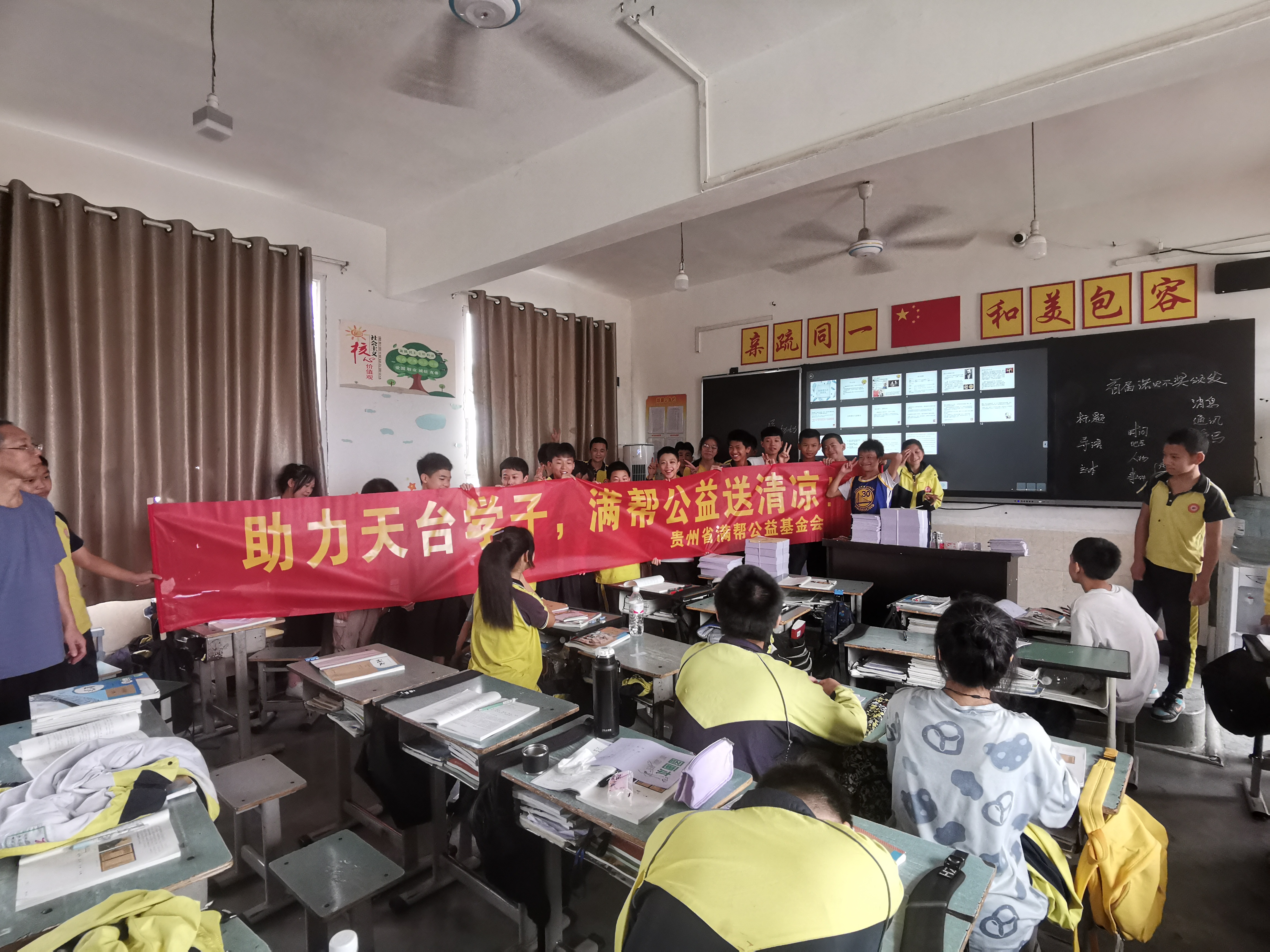 在贵州省民政厅的牵头推动下,贵州满帮公益基金会紧急启动帮扶程序,为天台学校初中部无偿捐助了空调制冷设备。经过2天时间的采购、安装与调试,如今该校初中部13个教室的空调设备已紧急安装完成。